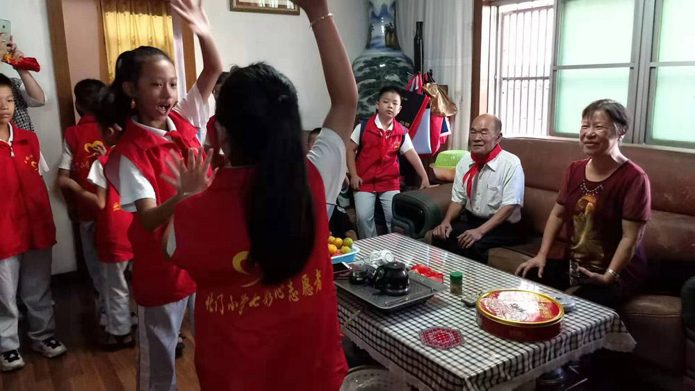 为进一步加强中华民族优秀文化传统和中国革命传统教育,丰富“我们的节日•重阳”主题活动内容,积极弘扬优秀传统文化,后溪洋社区关工委协同北门小学学生和家长志愿者们开展重阳节慰问活动。学生和家长志愿者们到辖区退役老军人家中慰问,学生们为老人带来了慰问品。小志愿者们围坐在退役老军人爷爷身边,倾听老爷爷讲述当年战争岁月里惊心动魄的历史故事。随后,小志愿者们给老军人爷爷戴上了鲜艳的红领巾、敬上少先队礼,还给老爷爷表演了精彩的小节目。