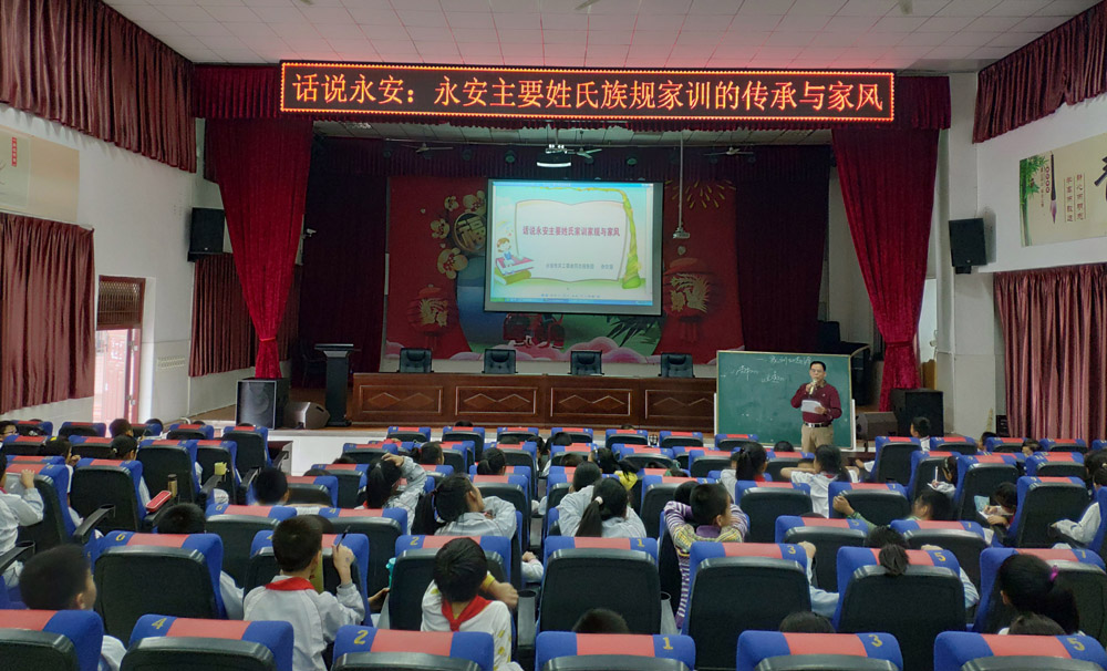 为开展好“中华魂”《爱我中华——新国成立70周年》主题教育系列活动,11月12日下午,燕江小学特邀请市关工委老同志报告团成员余尔望为学校师生开设《话说永安:永安主要姓氏族规家训的传承与家风》讲座。