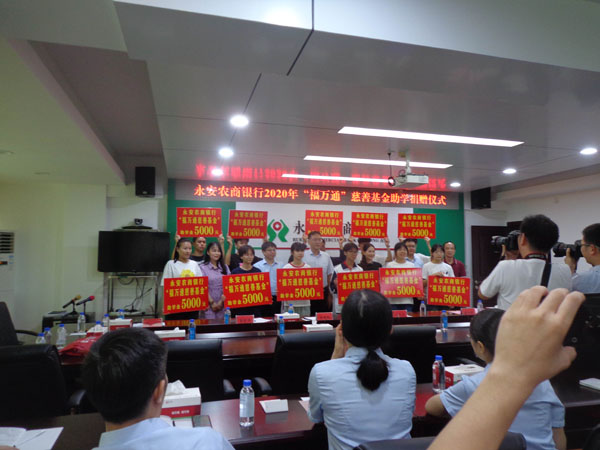 9月17日上午,永安市农商行举行2020年“福万通”慈善基金助学捐赠仪式。10位大学新生和1位高中生得到每人5000元的助学金。
