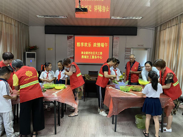 下午,林业新村社区关工委联合永安市燕城青少年事务社会工作服务中心志愿者与社区三牵手老同志在社区多功能教室和三实小“两童”一起参加“粽享快乐·浓情端午”的包粽子活动。