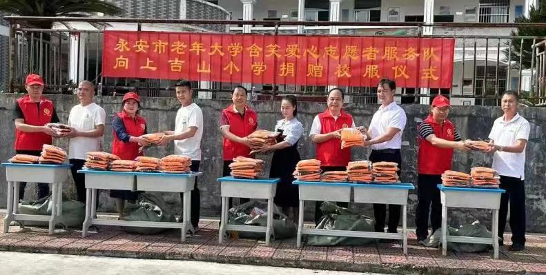 4月17日下午,永安市老年大学含笑爱心志愿服务队一行走进永安市燕西街道上吉山小学,开展捐物助学活动。永安市老年大学党委书记、校长郭惠勇、关工委执行主任、志愿服务总队总队长傅增合、教育局副局长邓小华、燕西街道党工委副书记黄毅,含笑爱心志愿服务队陈健、曹汉洋、黄小英、罗祖凤、杨上杰、罗海英、林苏华等八位同志,西门小学校长冯美芯及部分师生代表参加了本次捐赠活动。