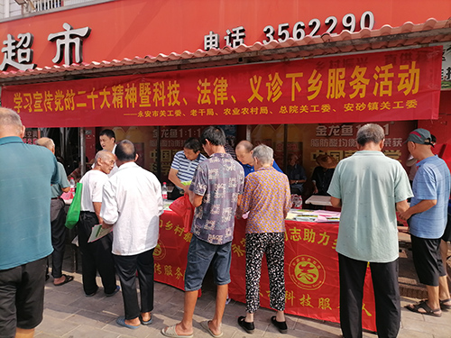活动现场,展示宣传展板,向当地群众发放党的二十大精神及习近平总书记重要指示精神等宣传单200多份,发放《未成年保护法》《预防未成年人犯罪法》《家庭教育促进法》法律读本及《雷竹林丰产培育实用技术(50问)》农业生产书籍资料150多份,发放综治宣传袋160余个,接受当地群众的有关法律咨询80多人次,医疗卫生老专家、老医生为民义诊、义检服务90多人次,帮助基层百姓解决医疗需求,受到当地群众的高度评价。