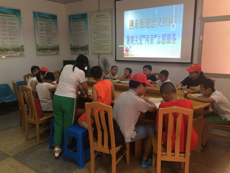忠义社区关工委组织志愿者给辖区两童辅导暑期课程