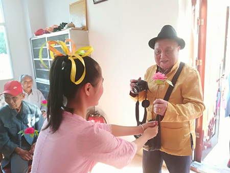 永安市第三实验小学的学生们还带来了自己制作的丝网花献给爷爷、奶奶,祝愿老人们健康长寿、万事如意。林业新村幼儿园的小朋友们为爷爷、奶奶送上来新鲜的水果,将它们送到老人家的手中,还送上了爱的抱抱。老人们都高兴得直夸孩子们都是好样的!