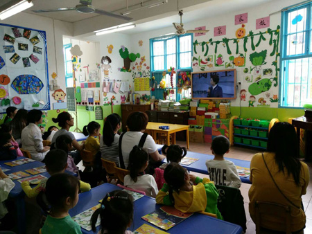 为了深入贯彻落实党的十九大精神和习近平新时代中国特色社会主义思想,全面贯彻落实习近平总书记关于“注重家庭、注重家教、注重家风”的重要指示精神,大力培育和践行社会主义核心价值观,深化家庭文明建设,建设书香家庭,助力创建省级文明城市。4月23日上午东门社区关工委组织社区居民群众及永福幼儿园、嘉裕幼儿园师生、家长收看人民网直播的“书香飘万家”2018全国家庭亲子阅读主题活动。 蒙曼老师的演讲让大家受益匪浅,而且她的领跑和陪跑的概念也引起了已为人父、为人母的同事的反思和共鸣。纷纷表示:以后一定多抽点时间陪伴孩子阅读和学习,把阅读当成习惯,让家庭飘满书香,并把这种阅读的优良传承在育龄妇女育儿知识培训中发扬光大。