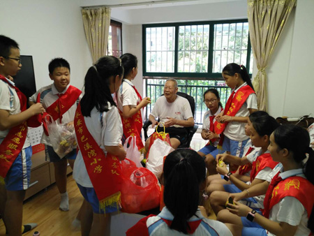9月21日下午,新安社区关工委组织巴溪湾小学红领巾志愿者走访慰问辖区军烈属何秀能,送上慰问品,并致以节日的问候。