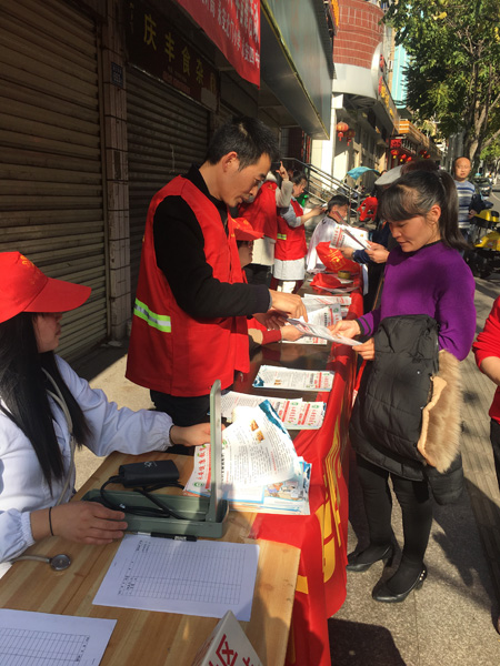 在燕北街道红山社区服务中心门口,志愿者们开展了丰富的便民志愿活动,为社区居民提供食品安全、消防安全知识普及,免费量血压、血糖,法律维权咨询,经济普查宣传,民政相关政策咨询,义务维修雨伞,计生政策咨询,免费理发服务等等……