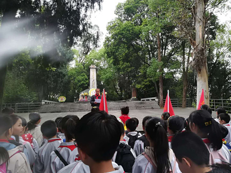 4月3日下午,燕江小学五年级全体师生在少先队辅导员罗文香和关工委老教师刘盛周的带领下,来到了铁路革命烈士陵园,开展“风展红旗如画—传承红色基因”祭扫、悼念烈士英雄活动。