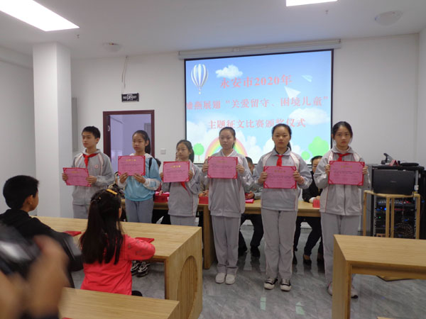 b仪式上为 “关爱留守、困境儿童”征文活动获奖的选手颁奖。