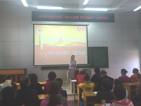 1月8日上午,燕东街道忠义社区关工委和实验小学共同举办德育“三牵手” “老少心相聚 携手迎新年”。参加本次活动的有老年志愿者、未成年人、家长、教育志愿者等共80余人。