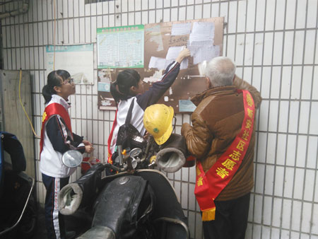 为迎接市城市卫生检查,借助新安居委会整治辖区各小区卫生,利用星期天学生不上课的时机,新安社区关工委组织永安六中的学生志愿者参与活动,小志愿者们在社区关工委“五老”志愿者的带领下,对生活区墙上、过道上的小广告进行清理。新安社区关工委以老带新,通过各种活动,培养学生志愿者参与社会实践活动的自觉性,促进关心下一代工作的开展。