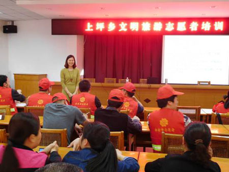 为了更好服务上坪乡旅游业,近日,上坪乡关工委、妇联、团委联合举办了文明旅游志愿者培训班活动。培训邀请学前心理学讲师、国家二级心理咨询师张雅红老师讲授了一堂“构建文明旅游、礼仪必须先行”的志愿者培训课。张老师从古代到现代,从站姿、坐姿、走姿到服饰,从握手到拥抱等各个方面入手,详细介绍了志愿者在进行各种活动时必须注意的事项,并将游戏带入到课堂中,充分起到寓教于乐的效果,整个课堂充满了欢声笑语、热烈掌声。